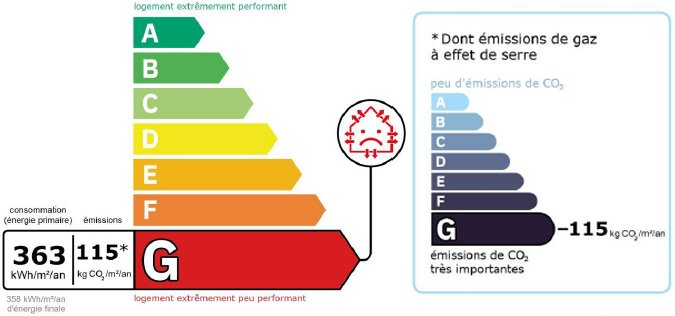 Valeur Gaz Effet de serre classe G - 65Kg CO2/m2/an